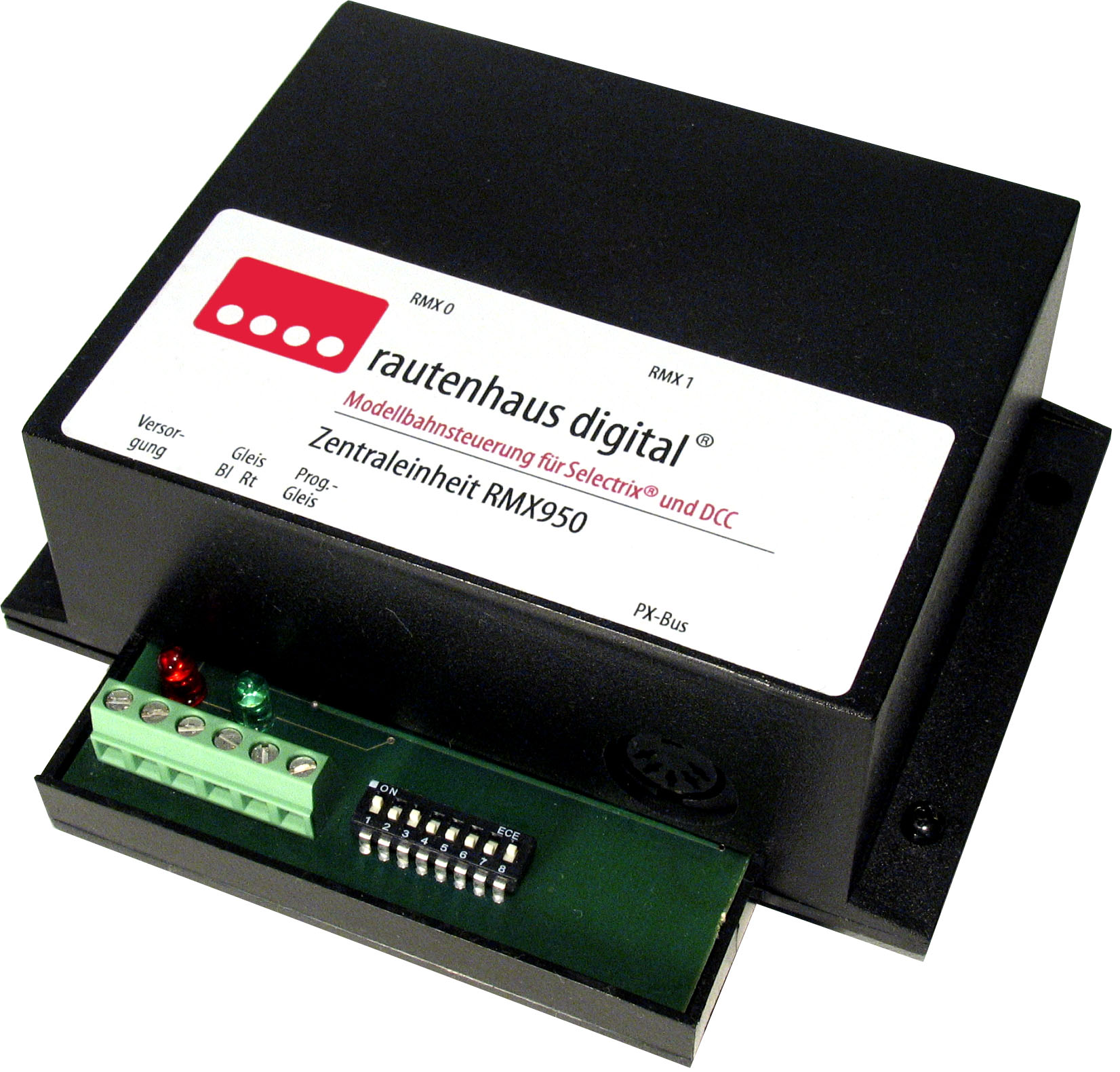 Die Multiprotokoll-Zentraleinheit zur digitalen Steuerung von Modellbahnanlagen im DCC-, Selectrix®-, Selectrix2- und rautenhaus digital®-Adressdynamik-Format ist das Herz der Digitalsteuerung. Diese neue Version der Zentraleinheit unterstützt alle gängigen Gleisformate für alle DCC-Lokomotiven mit 14, 28 oder 126 Fahrstufen, sowie kurzen und langen Adressen. Ebenfalls können alle bisherigen Selectrix-Lokadressen (1-103), Adressdynamik- und das neue Selectrix2-Format mit den Adressen 1-9999 angesteuert werden. Intern arbeitet das RMX-System mit den RMX-Adressen 1-9999. In der Lokdatenbank der Zentrale werden diesen Adressen das Datenformat, die reale Adresse und ein bis zu 12-stelliger Lokname zugeordnet und gespeichert. Die Zentraleinheit RMX950 ist zum Einsatz mit allen Spurweiten ausgelegt und bietet mit ihrer Ausgangsleistung von 3A ausreichend Fahrstrom auch für große Spurweiten.